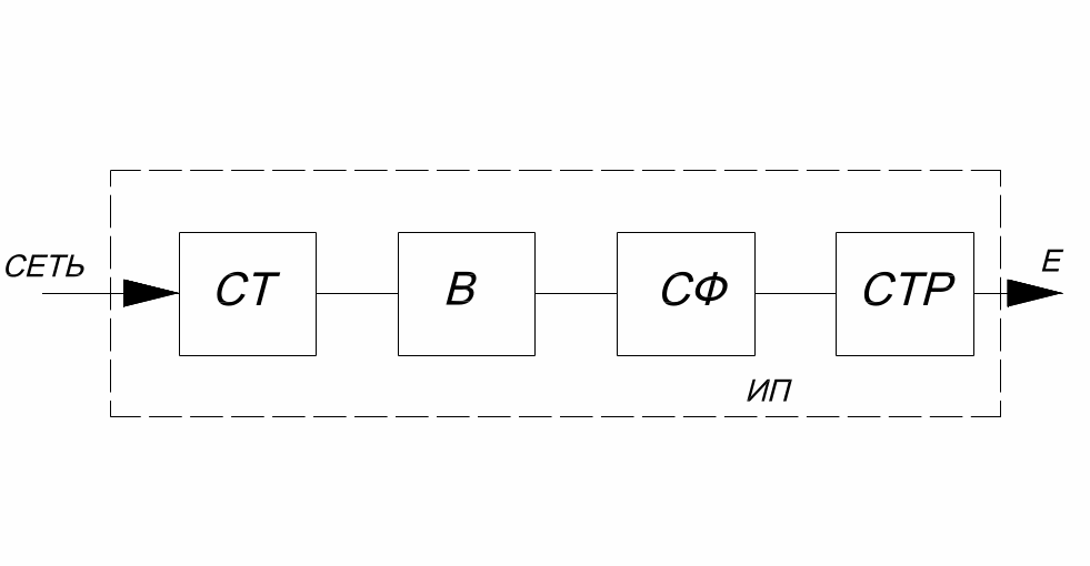 СФ – сглаживающий фильтр. Это устройство (как правило это конденсатор), которое преобразует пульсирующее напряжение в постоянное и уменьшает уровень пульсаций входного напряжения.