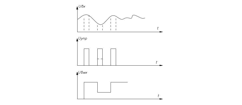 При подаче Uупр на ключ он замыкается и при условии нулевого напряжения источника входного напряжения конденсатор мгновенно заряжается до входного напряжения и повторяет это напряжение. При размыкании ключа напряжение на конденсаторе сохраняется значение непосредственно предшествующее размыканию и хранит его до следующего управляющего импульса.