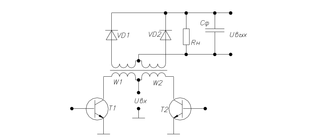 В данной схеме обмотки W1 и W2 поочерёдно подключаются к земле через Т1 и Т2. При этом в выходной обмотке трансформатора наводится серия положительных и отрицательных импульсов, которые с помощью выпрямительных диодов VD1 и VD2 преобразовывается в постоянное напряжение и сглаживается с помощью С – фильтра. Можно поставить и мостовой.