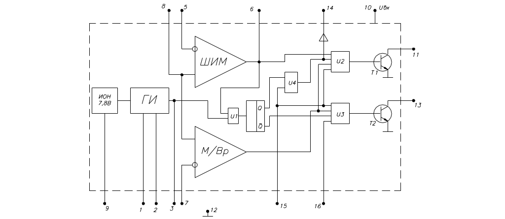 Температурно-скомпенсированный ИОН с максимальным выходным током не более 0,4 мА (вывод 9).