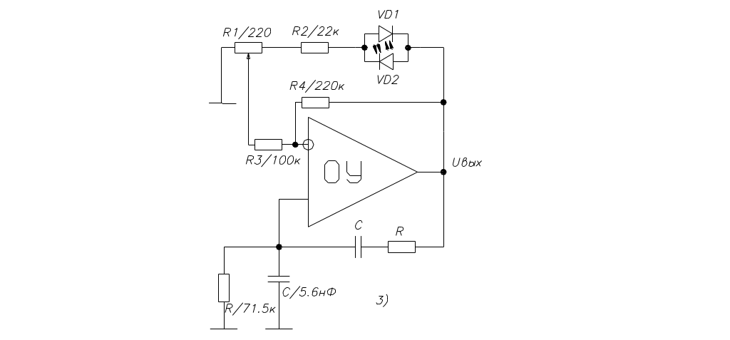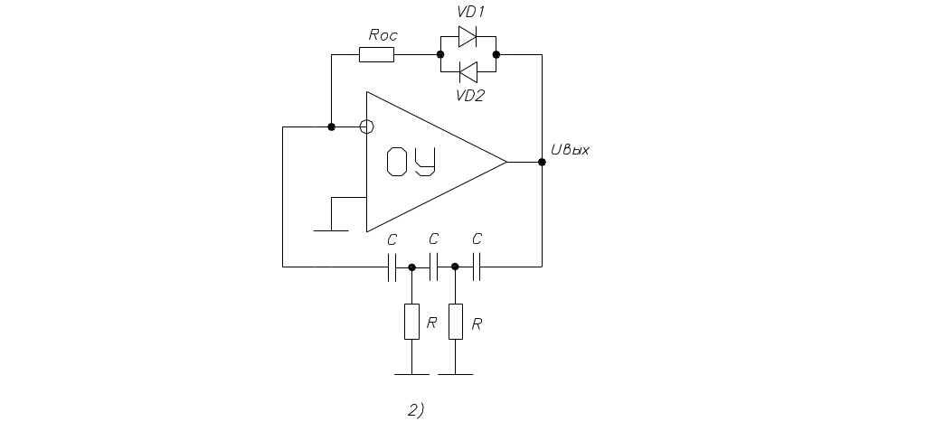 По мере возрастания напряжения на диодах их эквивалентное сопротивление падает до тех пор пока не наступит баланс амплитуд . Параллельно – встречно включенные диоды представляют собой нелинейный элемент типа насыщения.