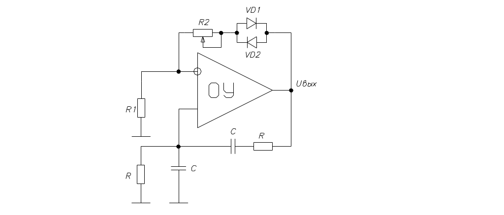 Пока диоды заперты коэффициент усиления ОУ очень высок. По мере нарастания выходящего напряжения , эквивалентное напряжение цепи обратной связи уменьшается , восстанавливается баланс амплитуд.