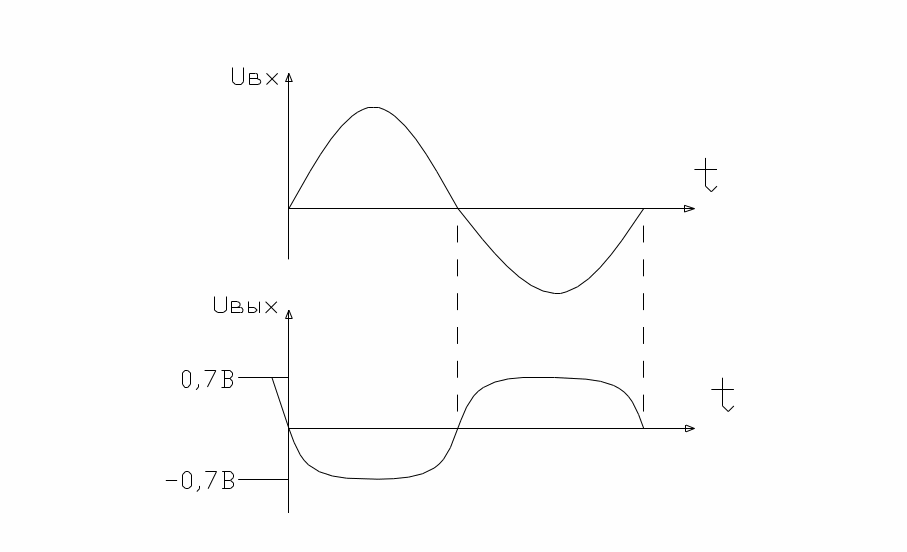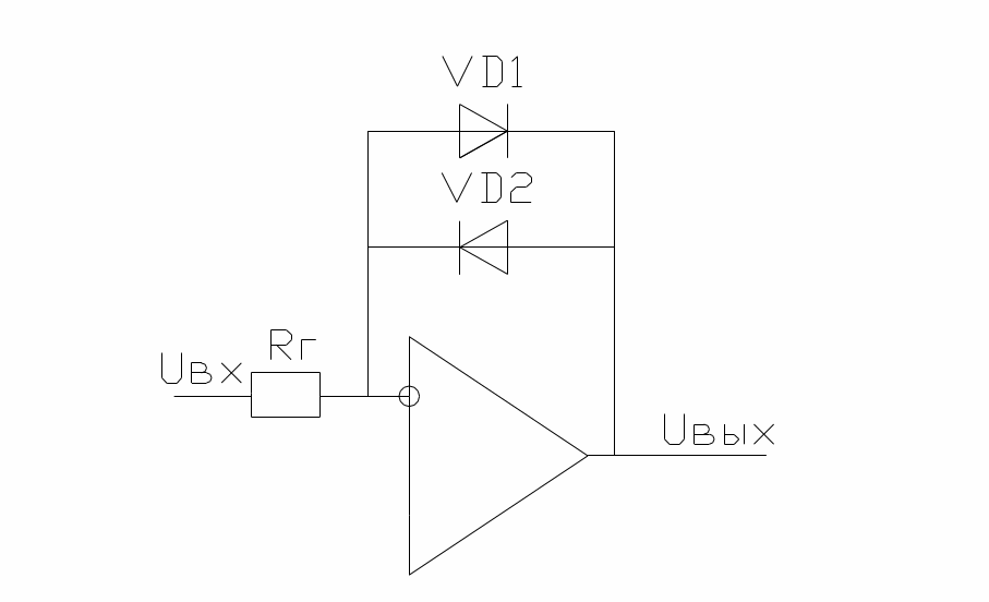 При небольших входных сигналах диоды заперты и в обратной связи стоит сопротивление запертого диода на уровне сотни кОм. Коэффициент усиления при этом очень высок и входной сигнал в области в моменты перехода через ноль усиливается на этот коэффициент усиления. Когда диоды открыты, коэффициент усиления низкий и выходной сигнал не превышает напряжение на открытом диоде. При этом области входного сигнала соответствующие моментам перехода через ноль резко увеличивают свое крутизну.