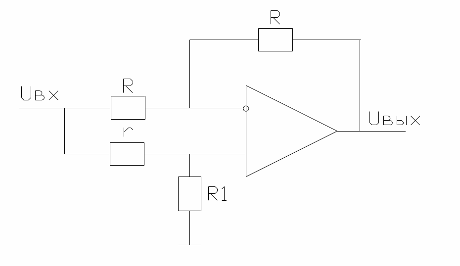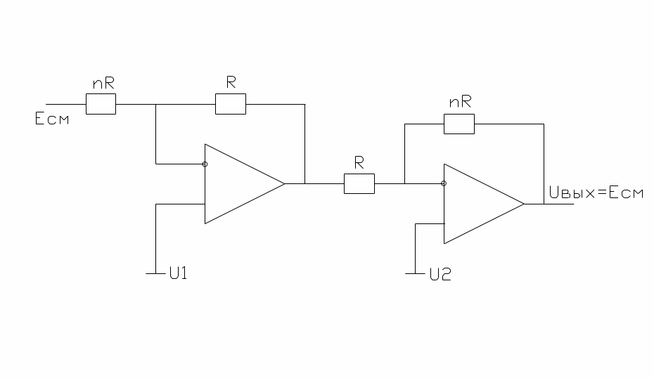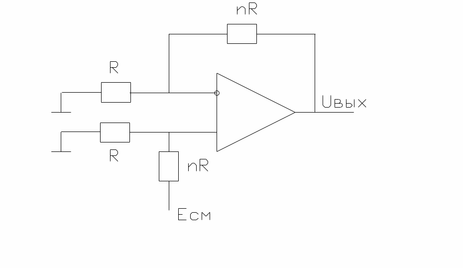 Достоинство: высокое входное сопротивление. Простота регулировки усиления и простота реализации в интегральном исполнении. Уровень синфазной составляющей не усиливается.