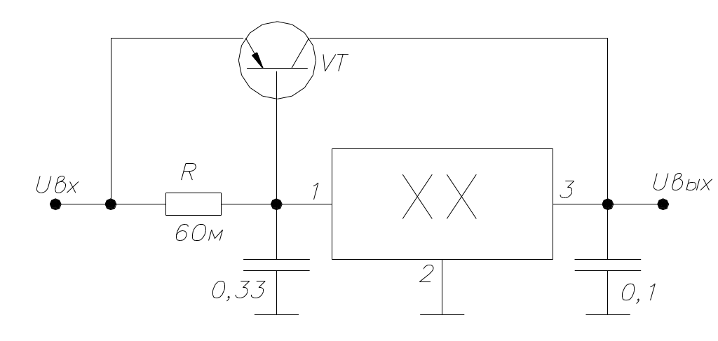 При токах больших, чем 100мА, открывается VT, а реальный ток через стабилизатор ограничивается уровнем 100 мА. В данном случае стабилизатор управляет базоэмиттерным переходом управляющего транзистора.