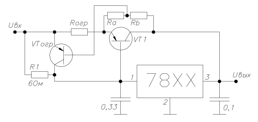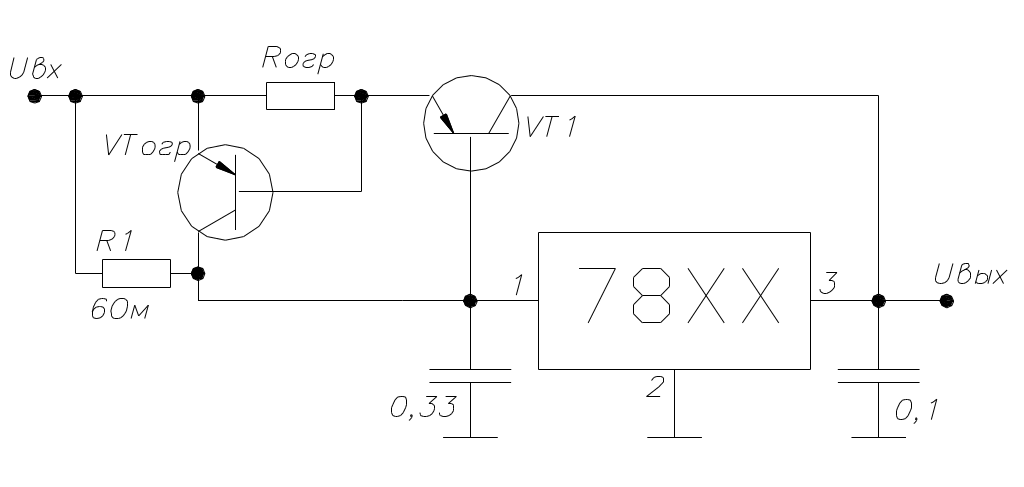 VTогр реагирует на ток нагрузки за счёт падения напряжения на Rогр и ограничивает запуск этого транзистора, если падение напряжения на Rогр превышает 0,6 В (напряжение БЭ ограничивающего транзистора). Тем самым осуществляется защита типа «токоограничения». При уменьшении сопротивления нагрузки ток через VT1 ограничен и тем самым напряжение на нагрузке падает. Когда Rн=0, ток не изменится.