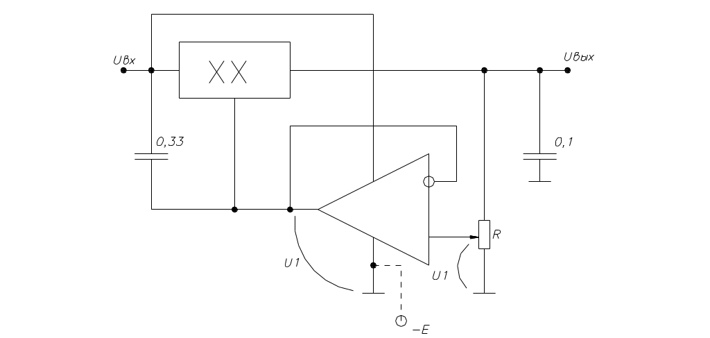 Недостаток данной схемы в том, что минимальное выходное напряжение ОУ не может быть меньше чем 2,5÷3 В. Для того чтобы сделать выходное напряжение стабилизатора ниже, надо подать на отрицательную ногу питания –Е.