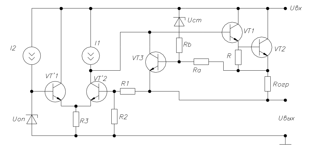 VT’1, VT’2, - эквивалент операционного усилителя, на инвертирующий вход которого через делитель R1, R2 подаётся выходное напряжение, на неинвертирующий вход подаётся опорное напряжение. Выход VT’2 управляет составным регулирующим транзистором VT1, VT2. Элементы: Rогр, Ra, Rb и стабилитрон, VTогр образуют цепь защиты стабилизатора от перегрузок. Реализовано токоограничение с загибающейся характеристикой. В стабилизаторе реализована типовая защита от перегрева кристалла.