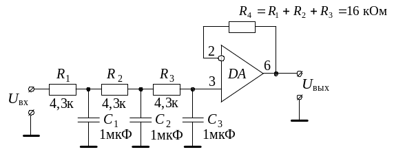 Для упрощения выбираем схему фильтра, состоящую из пассивных R-C звеньев. Выберем трехзвенный фильтр. Его схема дана на рисунке 5.7.