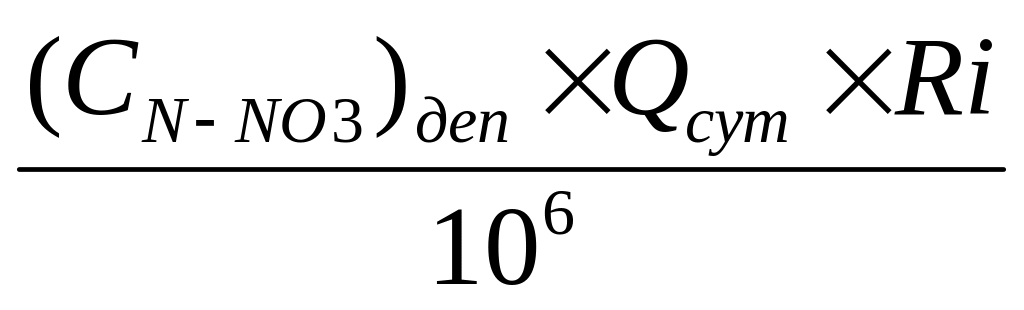 где (СN-NO3)en и (СN-NO3)ц – концентрация азота нитратного соответственно в исходной сточной жидкости и в циркулирующем иле, составляет: (СN-NO3)en=0 мг/л, (СN-NO3)ц = 9 мг/л;