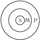 Отношения между именами «газ» (М), «летучее вещество» (Р) и «аргон» (S) представляются тремя концентрическими кругами: круг S входит в круг М, а последний (содержащий круг S) – в круг Р.