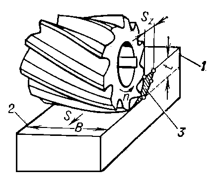 Рис. 13. Схема резания при фрезеровании цилиндрической фрезой: 1 — обрабатываемая поверхность; 2 — обработанная поверхность; 3 — поверхность резания.