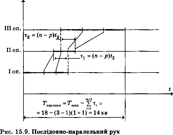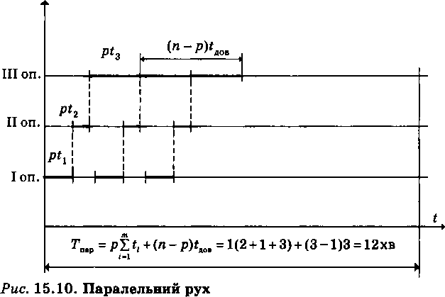 Розрахувати тривалість операційного циклу для послідовного, послідовно-паралельного та паралельного видів руху предметів праці за такими вихідними даними: норми часу за операціями становлять: tx = 2 хв, t2 =1 хв, £3= 3 хв; величина партії деталей складає п — 3 шт.; транспортна партія І> = 1 шт.
