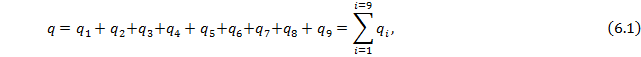 q1 – пайдалы қолданылған жылу, ГТҚ білігінде механикалық жұмысқа айналады; қазіргі заманғы ГТҚ – да q1 =22÷32% деңгейінде табылады; q2 – шыққан газдар арқылы жоғалған жылудың шығыны; қазіргі заманғы ГТҚ – да q2 = 60÷70% - ті құрайды - ГТҚ – да жанған отын жылуынан; q3 – жанған отынның химиялық толықсыздығынан болатын жылу шығыны (1,5-2%); q4 – жанармайдың жылу шығындары, ол турбинадан шығатын газдардың кинематикалық энергиясының шығынына эквивалентті:(0,2-0,3%); q5 - жанармайдың жылу шығындары, ол қондырғының тығыздалмағандығынан ауаның шығыны мен үйкелістен болатын механикалық шығындардың қосындысына эквивалнтті (2...2,5%); q6 – ГТҚ – ға кірер кездегі ауаны жылытуға арналған жүйені қосқан кезде остік компрессорлардың жетегіндегі жылудың шығыны (2...4%); q7 - конвекция мен радиация жолымен қоршаған ортаға жылудың шығындалуы (0,5...0,8%); q8 – подшипниктердегі майды қыздыру және оны салқындату жү йесіндегі жоғалған жылу шығыны (0,4...0,5%); q9 – ГТҚ – ды іске қосу және өту режимдерінің жұмыстары қалыптаспаған жылулық жағдай кезінде және корпусты, регенераторды, жүйе мен ГТҚ – ның тоғысуын (жай күйде =0) қыздыруға кеткен жылулық шығындар.