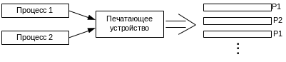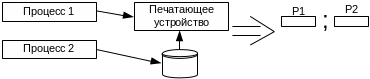 Процесс Р1 и Р2 выполняются мультипрограммно. Каждый из них требует печати строки. Строки обоих процессов будут перепутаны. Одним из способов решения этой ситуации является использование виртуального устройства.