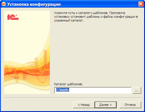 Если пользователя не устраивает предложенный по умолчанию путь, то он может ввести путь к другому каталогу. Система выполнит попытку установки шаблона конфигурации в указанный каталог и добавит этот каталог первым параметром ConfigurationTemplatesLocation файла 1CEStart.cfg, если попытка установки окончилась успешно.
