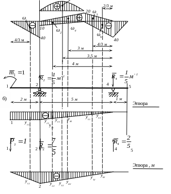 7.2. На единичных эпюрах вычисляем значения yj под центрами тяжести фигур ωj расчленённой грузовой эпюры.