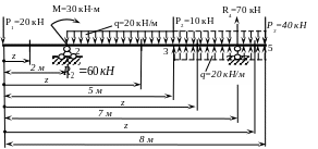 С этой целью расчётную схему представим в соответствующем виде (распределённую нагрузку q=20 кН/м продолжим до правого конца балки и тут же «скомпенсируем» её противоположно направленной q=20 кН/м), выбираем единую систему координат с началом в правом конце балки (рис. 4).