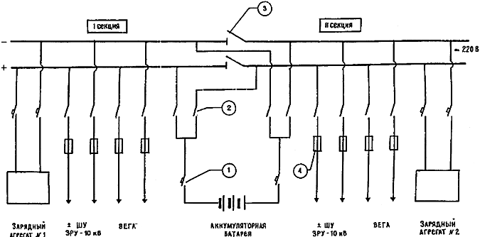 Типова однолинейная схема системи постійного струму напругою 220 В представлена на рис. 2.41, де 1 - автомат введення від акумуляторної батареї; 2 - рубильник введення на секцію; 3 - секційний рубильник.