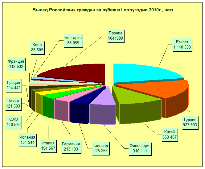 Рисунок 5 – Выезд российских граждан за рубеж в 1-м полугодии 2010 г, человек. Источникданных:http://tourest.ru/publ/statistica_turizma_v_rossii_2010.