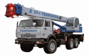 Кран стреловой автомобильный КС-55713-5В "Галичанин" грузоподъемностью 25 тонн смонтирован на четырехосном шасси КамАЗ-43118 с колесной формулой 6х6. Автокран предназначен для выполнения погрузочно-разгрузочных и монтажно-строительных работ на рассредоточенных объектах и может использоваться как в современных городах, так и в условиях удаленности от населенных пунктов. Привод крановой установки КС-55713-5В "Галичанин" осуществляется при помощи аксиально-поршневых гидронасосов. Крановые механизмы имеют индивидуальный привод с независимым управлением от гидромоторов и гидроцилиндров. Гидравлическая система крановой установки обеспечивает плавное управление всеми механизмами с широким диапазоном регулирования скоростей рабочих операций. Возможно одновременное совмещение до трех рабочих операций. Четырехсекционная телескопическая стрела длиной 9,5 - 28,0 м во втянутом положении обеспечивает крану компактность и маневренность при переездах, а в полностью выдвинутом - широкую рабочую зону и большую высоту перемещения груза при работе. Секции стрелы и другие ответственные узлы крановой установки и опорной рамы изготовлены с использованием высокопрочных сталей. Возможность телескопирования стрелы с грузом на крюке позволяет крану выполнять специальные задания: устанавливать грузы в труднодоступных местах, проносить их среди смонтированных конструкций. Большой размер опорного контура (4,9 х 5,8 м) позволяет производить работы с грузами в круговой зоне 360 градусов, при этом минимизируется количество перестановок при работе на объекте. Для удобства работы в стесненных условиях предусмотрен режим работы с грузами с установкой крана на опоры при втянутых балках выносных опор. Дополнительное оснащение стрелы решетчатым гуськом общей длиной 9,0 м расширяет сферу использования крана, площадь его зоны обслуживания и размер подстрелового пространства. Редукторы механизмов подъема груза и поворота крана планетарного типа с дисковыми тормозами, что соответствует современным требованиям, предъявляемым к грузоподъемным машинам. Во многих узлах крана установлены импортные комплектующие, не требующие замены и ремонта в течение всего срока службы крана. Для обогрева кабины машиниста крана используется автономный дизельный отопитель. Безопасную работу крана КС-55713-5В "Галичанин" обеспечивает комплекс приборов и устройств, в том числе микропроцессорный ограничитель нагрузки, показатели которого отражаются на дисплее в кабине машиниста. Прибор автоматически осуществляет защиту крана от перегрузки и опрокидывания, оснащен системой координатной защиты крана, необходимой для работы в стесненных условиях, имеет встроенные блок телеметрической памяти("чёрный ящик") и модуль защиты крана от опасного напряжения (МЗОН) для работы вблизи линий электропередач.