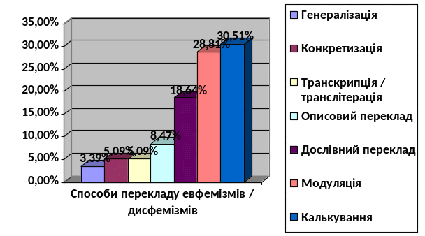 Отже, розподіливши та проаналізувавши знайдені нами 59 прикладів за способами їх перекладу, ми дійшли наступних висновків. Серед усіх можливих способів перекладу ми використовували лише транскрипцію / транслітерацію (3 приклади), калькування (18 прикладів), конкретизацію (3 приклади), генералізацію (2 приклади), модуляцію (17 прикладів), дослівний переклад (11 прикладів), описовий переклад (5 прикладів). Найчастіше для передачі евфемізмів та дисфемізмів вживають калькування (30,51 %) та модуляцію (28,81 %), як способи, що дозволяють максимально точно передати загальний сенс одиниці навіть за умов відсутності еквіваленту у мові перекладу. В графічному трактуванні це має такий вигляд.