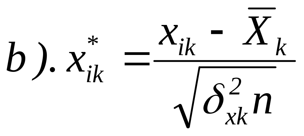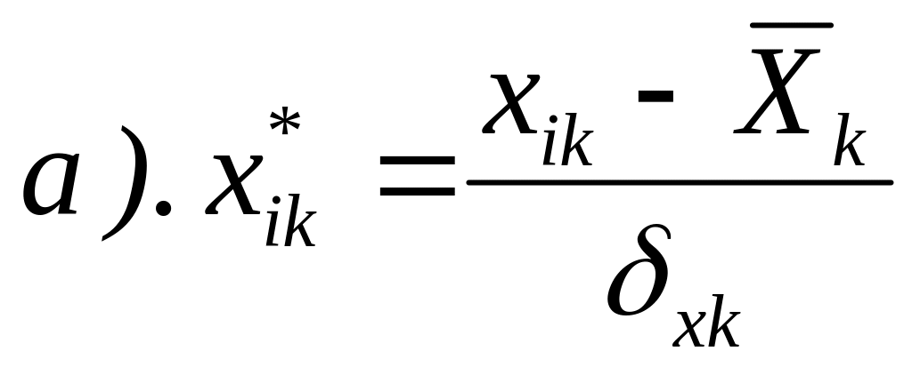 Матриця змінних факторів X замінюється стандартизованою матрицею X*, елементи якої обчислюють за формулами: