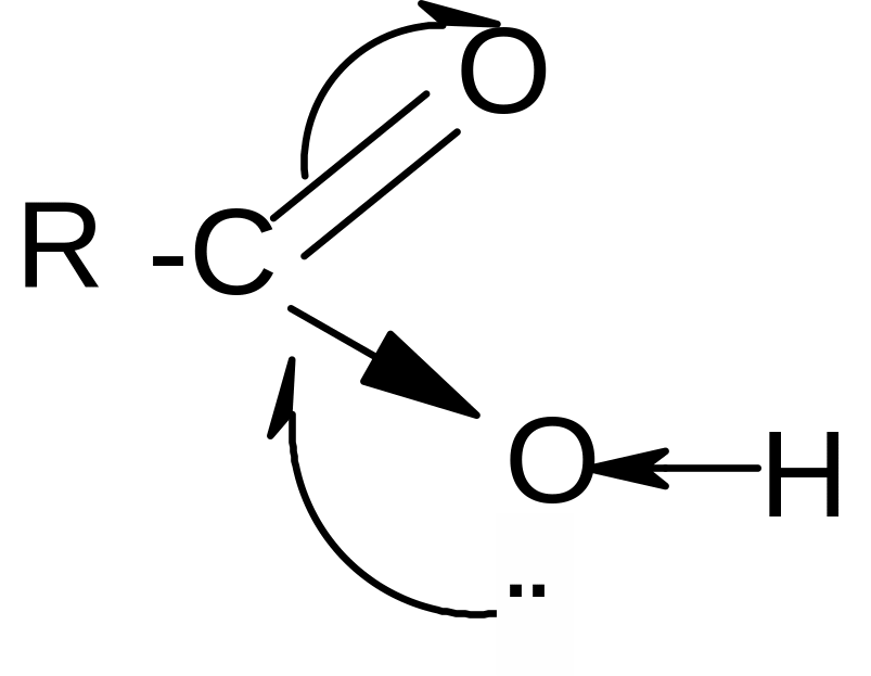 Благодаря +M –эффекту ОН - группы в карбоксильной группе возникает -сопряжение, происходит выравнивание электронной плотности в ней и сведение полярности карбонильной группы до минимума. Этим объясняется инертность карбонильной группы в кислотах. +М –эффект гидроксильной группы объясняет также смещение электронной плотности в ней в сторону более электроотрицательного атома кислорода и диссоциацию кислот.