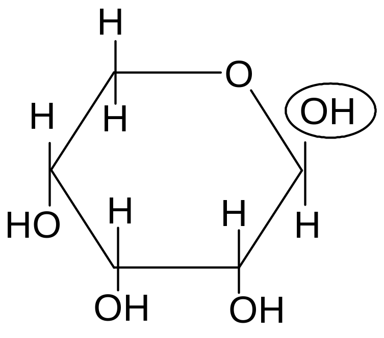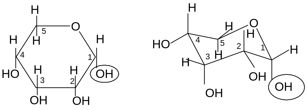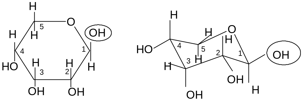 Углеводы в циклической форме существуют в виде неплоских конформаций. Так, для пиранозных форм наиболее энергетически выгодной является конформация «кресла».