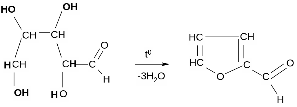 При действии минеральных кислот на моносахариды (пентозы или гексозы) происходит отщепление воды с образованием фурфурола (из пентоз) или 5-гидроксиметил-фурфурола (из гексоз):
