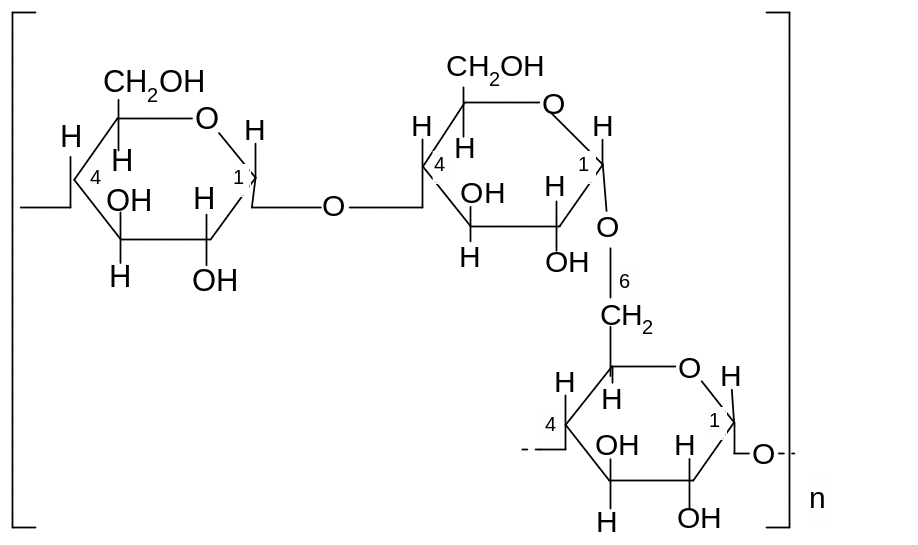Гликоген – резервный углевод высших животных и человека («животный крахмал»). Образуется и накапливается в печени и в мышцах, а при необходимости очень быстро расщепляется до глюкозы (в печени), или до молочной кислоты (в мышцах), что достигается при большом количестве концевых остатков, т.е. при большой разветвленности молекулы. Значительная молекулярная масса позволяет запасать большое количество молекул глюкозы в клетках.