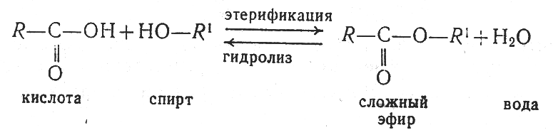 2 этап. Спирты реагируют с карбоновыми кислотами, при этом выделяется вода и образуется сложный эфир. Это реакция этерификации. Получаемый сложный эфир гидролизуется образующейся водой, поэтому идет обратимый процесс: