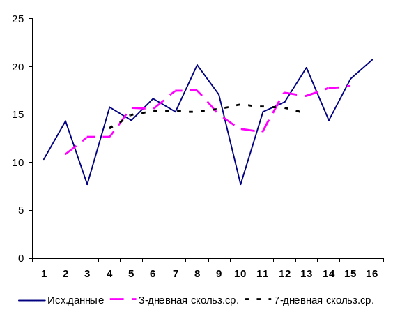 Вывод. Ряд, сглаженный по 7-дневной скользящей средней, имеет более ровный характер, что позволяет нагляднее увидеть тенденцию в исследуемом процессе. Ряд, сглаженный по 3-дневной скользящей средней, дает более полное представление о поведении исследуемого параметра, чем при 7-дневное сглаживании.