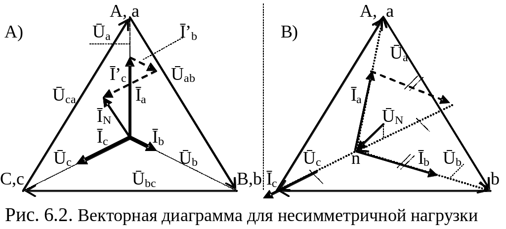 На рис. 6.2,а показана векторная диаграмма напряжений и токов неравномерной нагрузки, включенной по схеме звезда с нейтральным проводом. Отсутствие нейтрального провода нарушает симметрию фазных напряжений нагрузки, приводя к смещению между ŪNn источника и нагрузки (рис. 6.2,б). При обрыве одного из проводов, например, В-b в 4-х-проводной цепи, нагрузки данной фазы остаются без энергии: Ūbn = 0 (рис. 6.3,а).