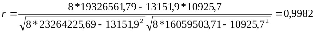 Коефіцієнт кореляції R=0,9982 свідчить про досить тісний зв’язок між прибутком та основними фондами.