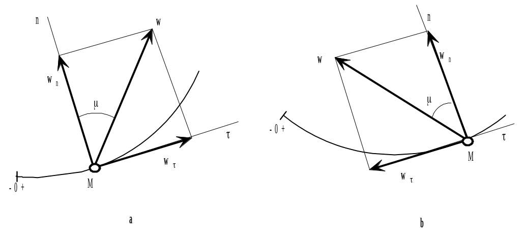 We have thus proved that the projection of acceleration of a particle on tangent to the path is equal to the first derivative of numerical value of the velocity, or the second derivative of the displacement (the arc coordinate) s, with respect to time; the projection of the acceleration on the principal normal is equal to the second power of the velocity divided by the radius of curvature of the path at the given point of curve, the projection of acceleration on the binormal is zero (wb = 0). This is an important theorem of particle kinematics.