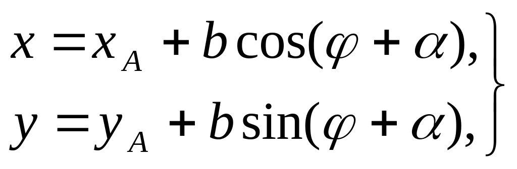Consider a point M of a body whose position in section S is specified by its distance b = AM from the pole A and the angle BAM = α (Fig. 18). If the motion of the body is described by Eqs. (48), the x and y coordinates of point M in the system Oxy will be