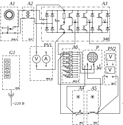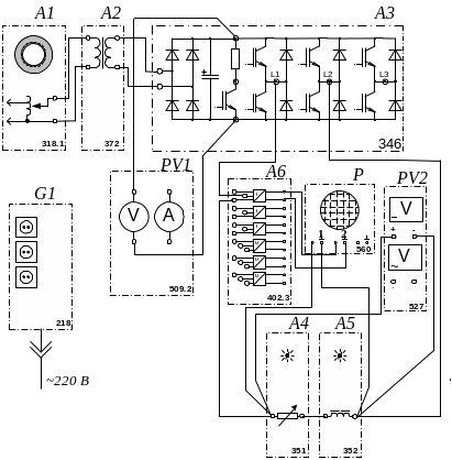 Регулируемый Автотрансформатор А1 совместно с трансформатором A2 – источник регулируемого синусоидального напряжения на входе силовой части МТП с обеспечением потенциальной развязки.