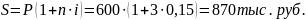 Пример 2.1. Сумма, равная 600 тыс. руб., дается в займы на 3 года под 15% годовых. Найти наращенную сумму и сумму процентов за этот срок, используя простые и сложные проценты.