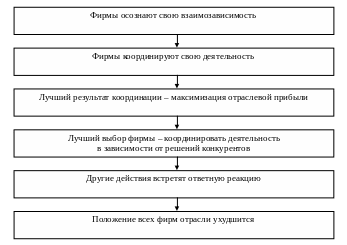 Если фирмы пассивно конкурируют, устанавливая высокие цены и ограничивая объемы производства, они получат более высокие прибыли, чем при агрессивной конкуренции. Но фирмы стоят перед дилеммой, когда ни одна из них не может ни доверять другой, ни ожидать, что ее конкурент назначит более высокую цену. В итоге, как уже отмечалось, рациональное поведение каждой из них ведет к очевидно нерациональному результату для обеих.