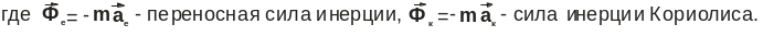 При этом переносная и Кориолисова силы инерции это векторные величины численно равные произведению массы точки на ее переносное и соответственно Кориолисово ускорение. Направление сил инерции противоположно направлению одноименных им ускорений.