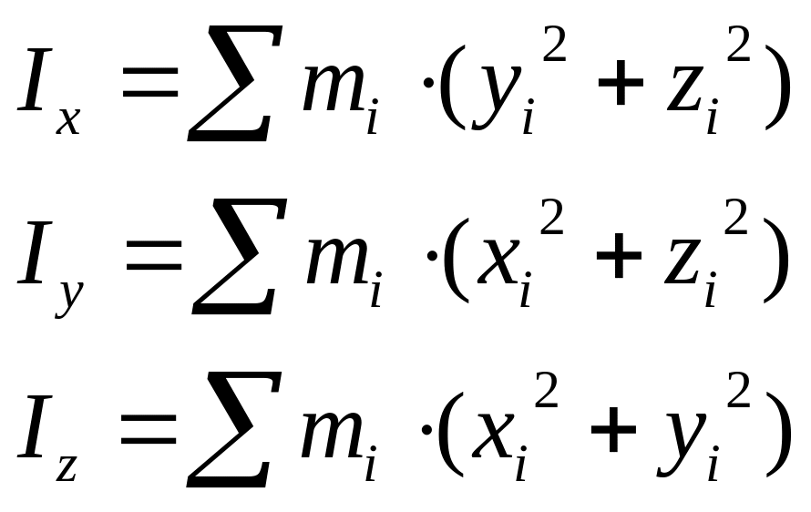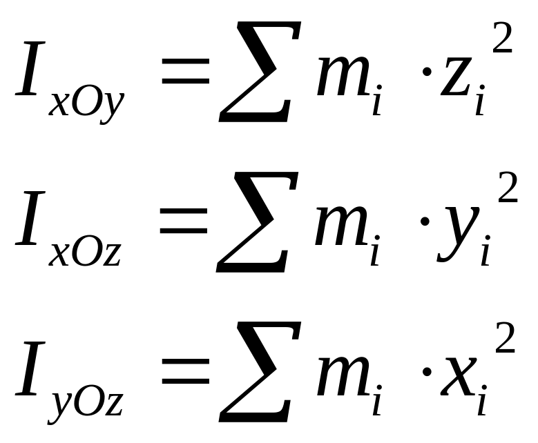 Зависимости между моментами инерции твердого тела относительно координатных осей, координатных плоскостей и начала координат имеют вид: