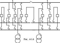 На стороне 6-10 кВ всегда применяется схема с одной рабочей секционированной системой шин. Количество секций зависит от типа трансформаторов (рис. 4-15, 4-16).