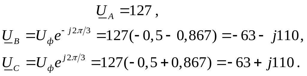 Полагая, что вектор напряжения UA совпадает с положительным направлением оси вещественных на комплексной плоскости (с+1), а его действующее значение равно UA = Uф = 127 В, система фазных напряжений будет иметь вид