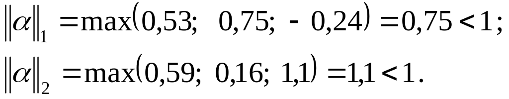 Процесс Зейделя для линейной системы Х = + Х также, так и процесс последовательных приближений, сходится к единственному решению при любом выборе начального приближения, если какая-нибудь из норм матрицы меньше единицы. То есть