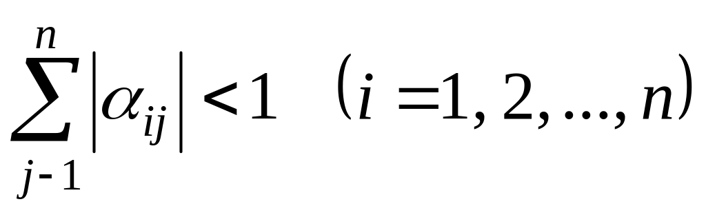 Таким образом, для сходимости вышеуказанных итерационных процессов достаточно, чтобы значения элементов ij при i j были небольшими по абсолютной величине. Это равносильно тому, что если для линейной системы АХ = В модули диагональных коэффициентов каждого уравнения системы больше суммы модулей всех остальных коэффициентов (не считая свободных членов), то итерационные процессы для этой системы сходятся, т.е. мы имеем систему