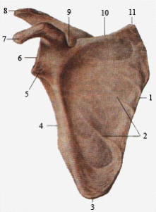 1-medial border of scapula; 2-posterior surface; 3-inferior angle; 4-lateral border; 5-neck of scapula; 6-glenoid cavity (lateral angle of scapula); 7-coracoid process; 8-acromion; 9-suprascapular notch; 10-superior border; 11-superior angle.