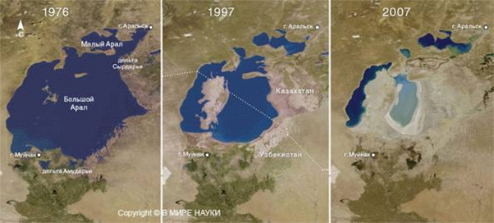 В Советском Союзе ухудшающееся состояние Аральского моря скрывалось десятилетиями, вплоть до 1985 г., когда М.С. Горбачев сделал эту экологическую катастрофу достоянием гласности. В конце 1980-х гг. уровень воды упал настолько, что все море разделилось на две части: северный Малый Арал и южный Большой Арал. К 2007 г. в южной части четко обозначились глубокий западный и мелководный восточный водоемы, а также остатки небольшого отдельного залива. Объем Большого Арала сократился с 708 до всего лишь 75 км3, а соленость воды возросла с 14 до более чем 100 г/л. С распадом СССР в 1991 г. Аральское море оказалось поделенным между вновь образованными государствами: Казахстаном и Узбекистаном. Таким образом, был положен конец грандиозному советскому плану по переброске сюда вод далеких сибирских рек, и развернулась конкуренция за обладание тающими водными ресурсами.