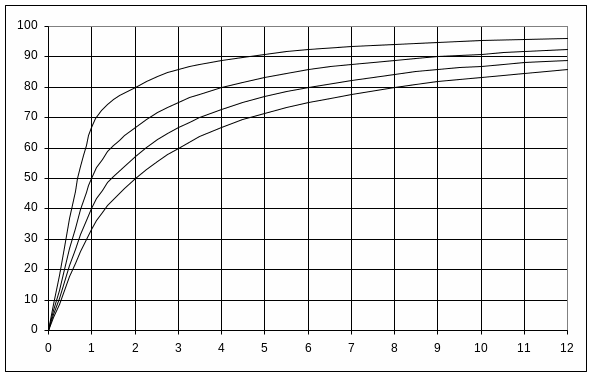 1 – tСУТ = 16 ч; tСТ = 0,75 ч; 2 – tСУТ = 16 ч; tСТ = 1,0 ч;