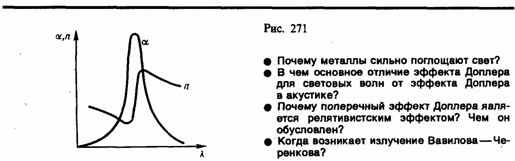 На рис. 271 представлены типичная зависимость коэффициента поглощения от длины волны света и зависимость показателя преломления n от в области полосы поглощения. Из рисунка следует, что внутри полосы поглощения наблюдается аномальная дисперсия (n убывает с уменьшением ). Однако поглощение вещества должно быть значительным, чтобы повлиять на ход показателя преломления.